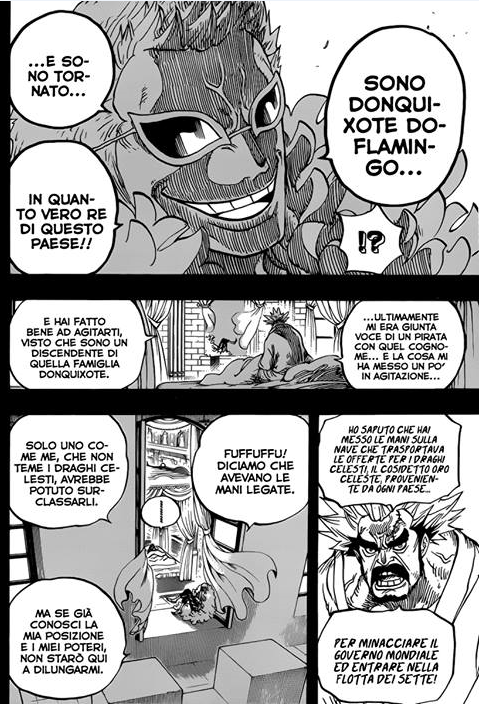 Dunque abbiamo da un lato Doflamingo che chiede di essere riconosciuto come Drago Celeste, dall'altro il Governo Mondiale che sotto il ricatto di vedersi sputtanato in giro il proprio segreto, è costretto ad accettare.